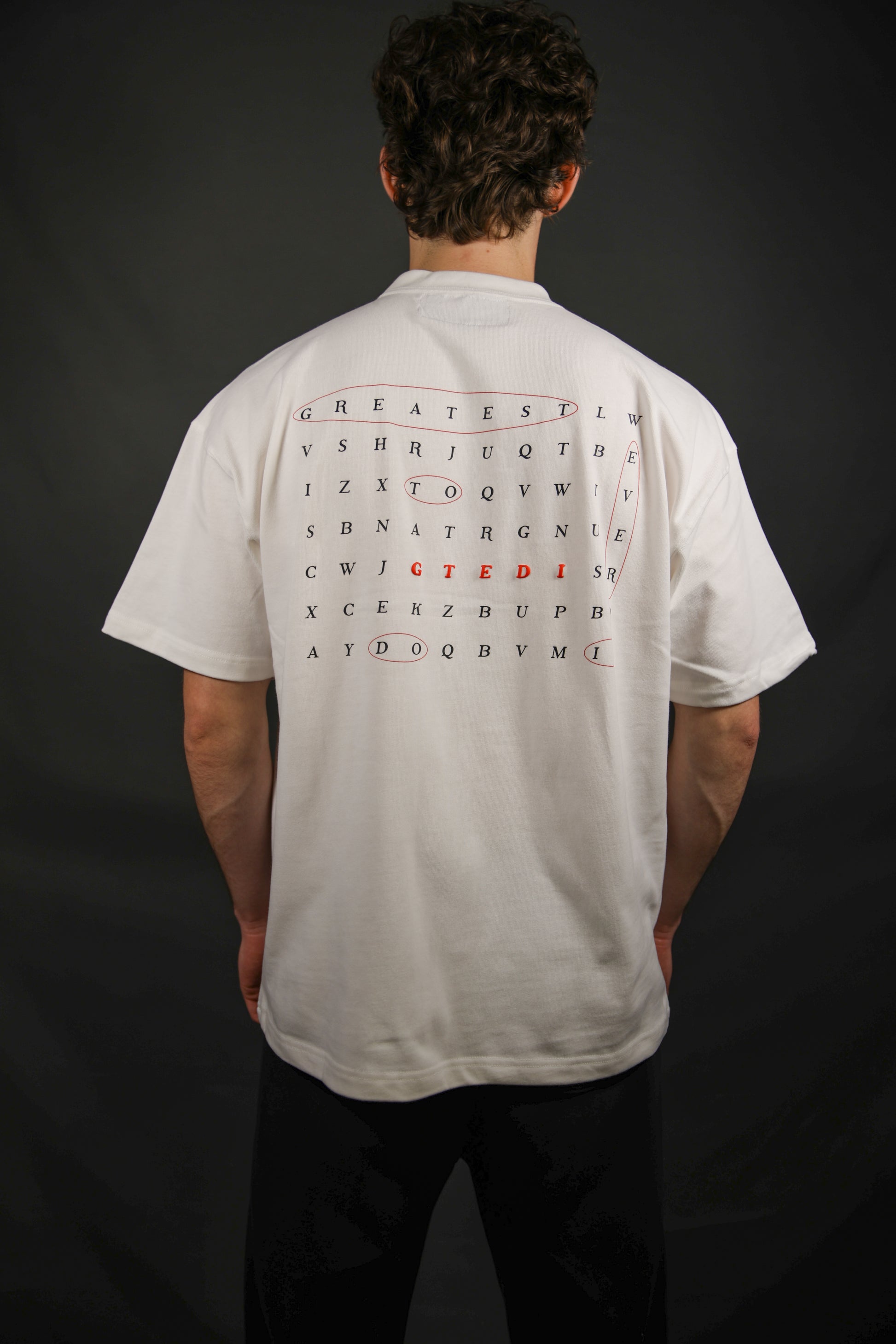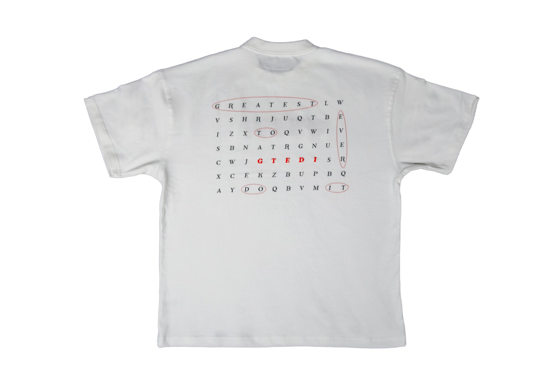 Wordsearch Tee - Heavyweight cotton tee. Slightly oversized with embroidered front, screen/puff print on the back. Custom tags. Limited quantity with each shirt having a unique number.